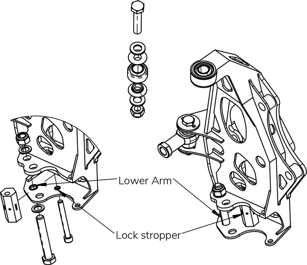 Use a M12 bolt and nut when installing those upper control arm spacers. Press those spacers into knuckle upper spherical bearing. Tightening the M12 bolt. Make sure that all the surfaces are parallel while tightening. Install the knuckle to the upper control arm. There are two setups for the lower control arm. Where the inside mounting point is for the OEM Corvette C5, C6 lower control arm. The second mounting point is for Wisefab lower control arm. Same applies with the adjustable lock stopper. Wisefab lock kits includes hexagonal lock stoppers. Where each side has a different offset. The more dimples, the more offset and by that less usable lock. Connect hub with OEM bolts, but use 3x M12 washers which came with knuckles. Add rotors and calipers.