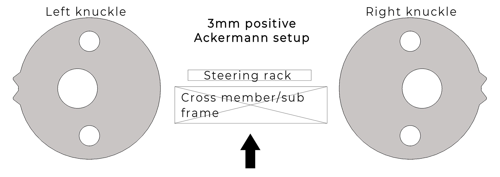 Here we can see the 3mm positive Ackermann setup where steering rack is locatad in front of the subframe the bumps/notches on the washers must face apart of each other in order to achive positive Ackermann setup.